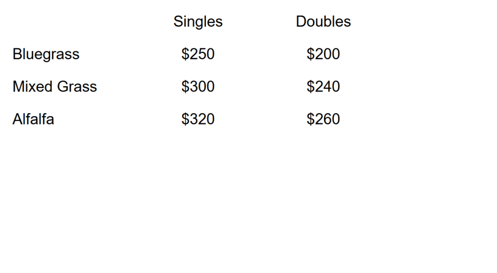 • Mixed grass – High quality, non-rain damaged timothy, smooth brome and or orchard grass.  This is the choice of the majority of owners.
